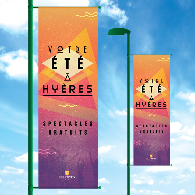 Ce type de montage de pavillon personnalisé permet de communiquer en extérieur sur tous vos événements. il se fixe sur un réverbère ou un lampadaire à l'aide de 2 potences (haute et basse).
