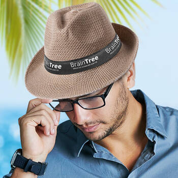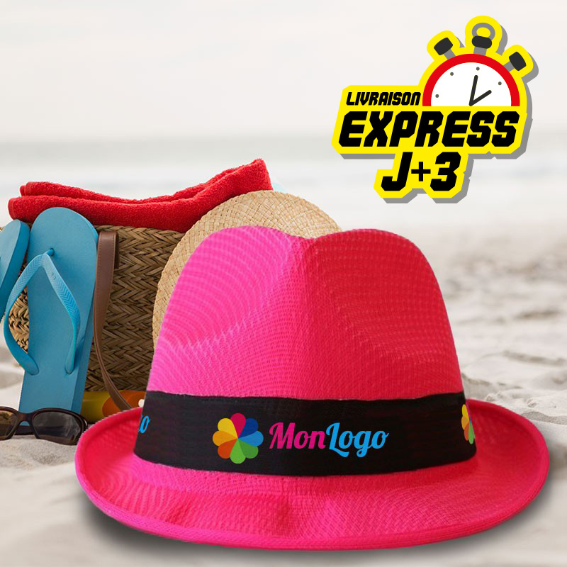 style Blues Brother's en paille synthétique (résistant à l'eau).Ruban personnalisé en quadri et COUSU sur le chapeau.