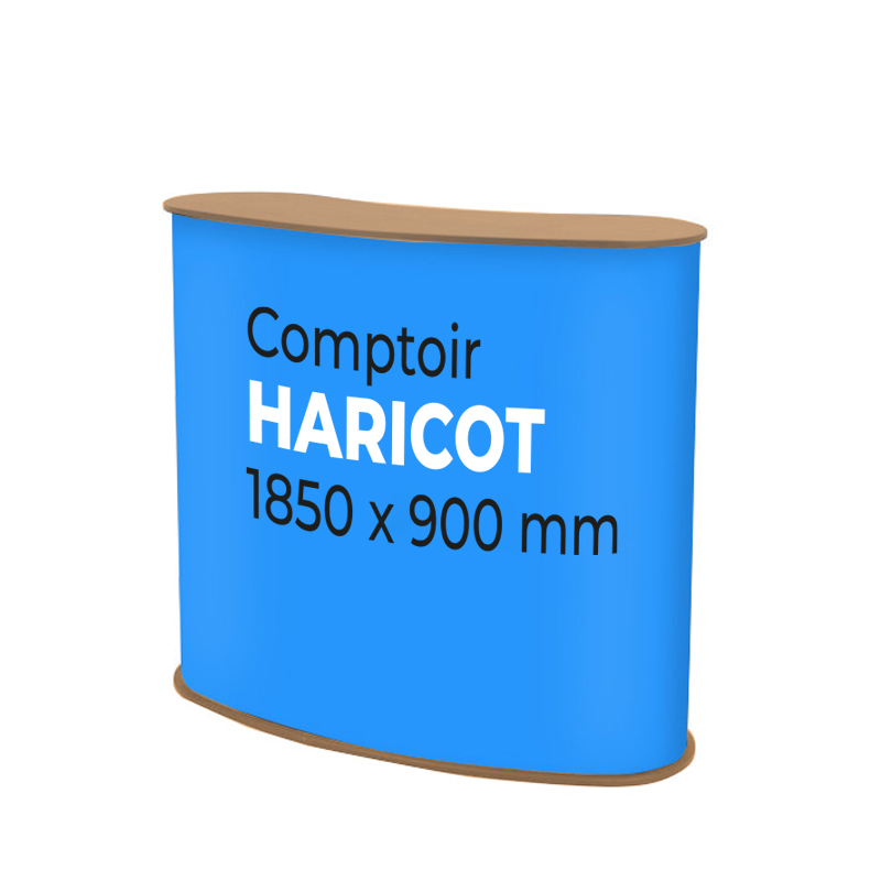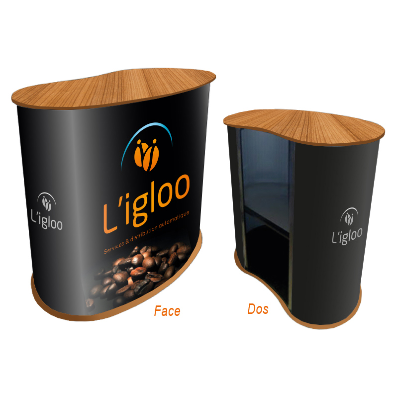 Comptoir - Banque d'accueil personnalisée publicitaire pour stand, foire et événementiel avec table en forme de "Haricot".