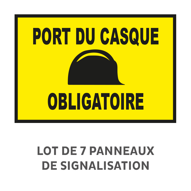 Lot de 7 Panneaux " port du casque obligatoire" Akilux Recto, en PVC alvéolaire 3,5 mm 650 gr/m² qui assure une excellente rigidité en gardant de la souplesse pour s'accorder à de légers arrondis (affichage sur barrière, courbes, clôtures, poteaux, ...).