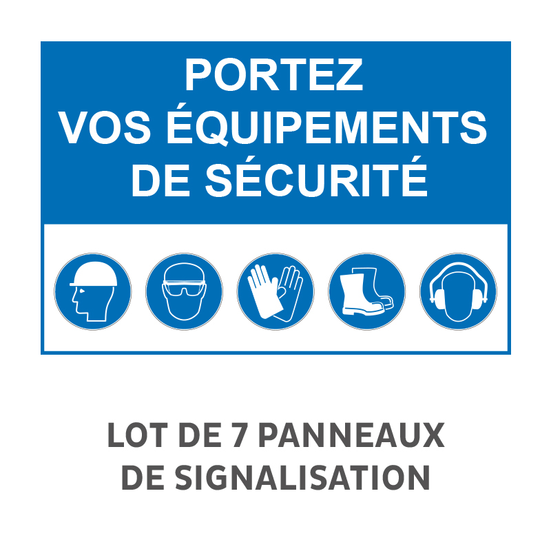 Lot de 7 Panneaux " portez vos équipements de sécurité" Akilux Recto, en PVC alvéolaire 3,5 mm 650 gr/m² qui assure une excellente rigidité en gardant de la souplesse pour s'accorder à de légers arrondis (affichage sur barrière, courbes, clôtures, poteaux, ...).