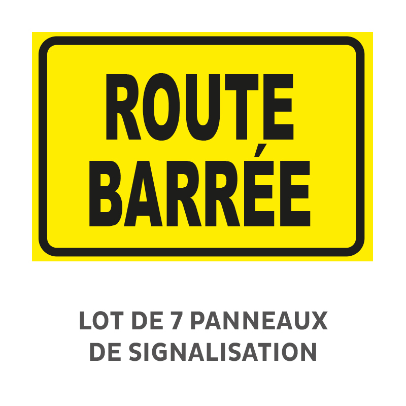 Lot de 7 Panneaux "route barrée" Akilux Recto, en PVC alvéolaire 3,5 mm 650 gr/m² qui assure une excellente rigidité en gardant de la souplesse pour s'accorder à de légers arrondis (affichage sur barrière, courbes, clôtures, poteaux, ...).