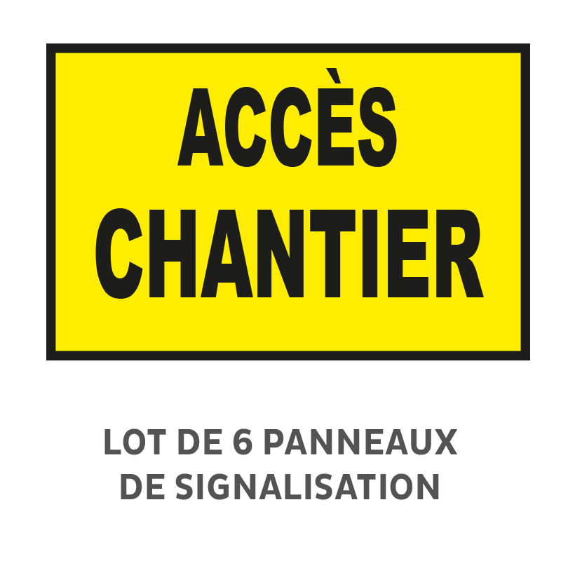 Lot de 6 Panneaux "accès chantier" Akilux Recto, en PVC alvéolaire 3,5 mm 650 gr/m² qui assure une excellente rigidité en gardant de la souplesse pour s'accorder à de légers arrondis (affichage sur barrière, courbes, clôtures, poteaux, ...).