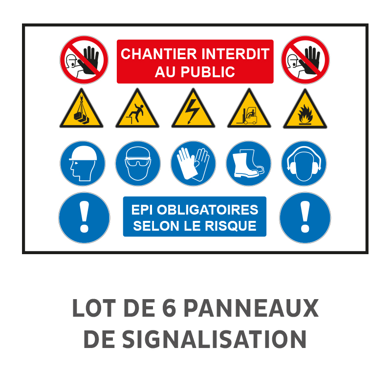 Lot de 6 Panneaux "chantier interdit au public" Akilux Recto, en PVC alvéolaire 3,5 mm 650 gr/m² qui assure une excellente rigidité en gardant de la souplesse pour s'accorder à de légers arrondis (affichage sur barrière, courbes, clôtures, poteaux, ...).