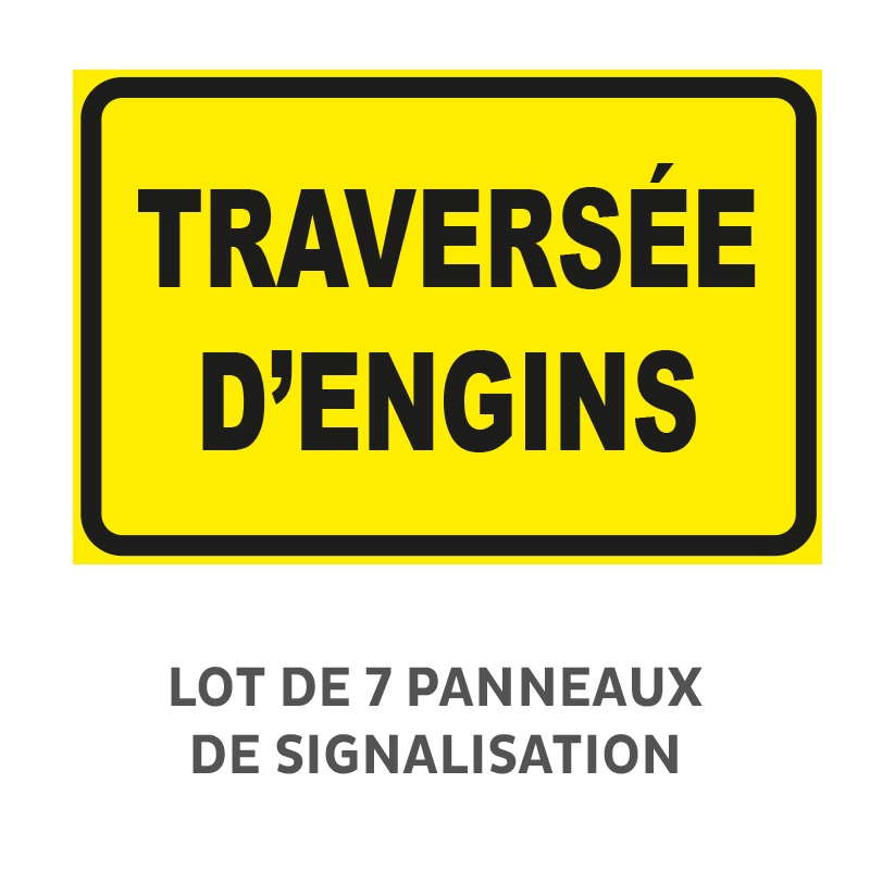 Lot de 7 Panneaux "traversée d'engins" Akilux Recto, en PVC alvéolaire 3,5 mm 650 gr/m² qui assure une excellente rigidité en gardant de la souplesse pour s'accorder à de légers arrondis (affichage sur barrière, courbes, clôtures, poteaux, ...).