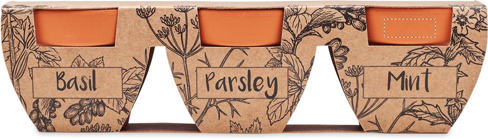 FLOWERPOT est l'objet publicitaire parfait pour insuffler une touche de verdure à vos campagnes de communication. Cet ensemble unique de 3 pots en terre cuite inclut des graines de menthe, persil et basilic, permettant de faire germer une ambiance naturelle et écologique. Fabriqué en UE, FLOWERPOT incarne l'élégance de la simplicité avec des dimensions compactes de 6X19X5 cm.Idéal pour des cadeaux d'entreprise innovants ou des goodies écologiques, FLOWERPOT est conçu pour capter l'attention de vos clients avec son matériau noble, la terracotta, qui assure robustesse et esthétique.Faire le choix de FLOWERPOT, c'est aussi bénéficier d'un accompagnement professionnel exceptionnel. Notre équipe vous guide dans la personnalisation du produit pour mettre en avant votre marque de façon optimale. Du choix des couleurs à la mise en place du marquage, nous garantissons un suivi personnalisé et réactif à chaque étape, de la conception jusqu'à la réalisation.Profitez de la spécificité de FLOWERPOT pour démarquer votre stratégie de communication. Sa personnalisation le transforme en un cadeau promotionnel mémorable à offrir lors de vos événements professionnels ou pour fidéliser vos clients.Quant aux délais de livraison, ils s'adaptent à vos besoins : comptez 4 jours ouvrables pour des produits sans marquage et entre 8 et 12 jours pour des articles avec personnalisation. Sur demande, une production en express est possible pour réduire les délais.N'attendez plus pour donner vie à votre marque avec FLOWERPOT. Demandez votre devis rapide et personnalisé dès aujourd'hui et laissez ce produit devenir le fer de lance de votre communication écologique.